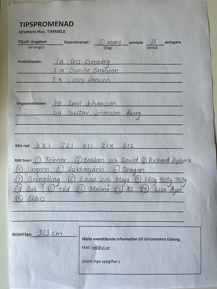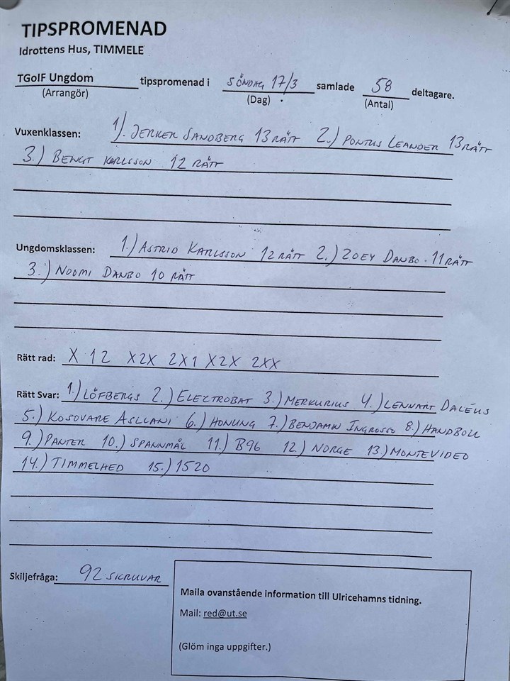 Här kommer resultatet av vårens första tipspromenad Vi kör 10 ggr på söndagar kl. 10-11.30 mellan 10/3-12/5 Ta gärna en gofika efter promenaden Välkomna att stödja våra fina ungdomar i Timmele GoIF Timmele GoIF 10 mar 2024 0kommentarer
