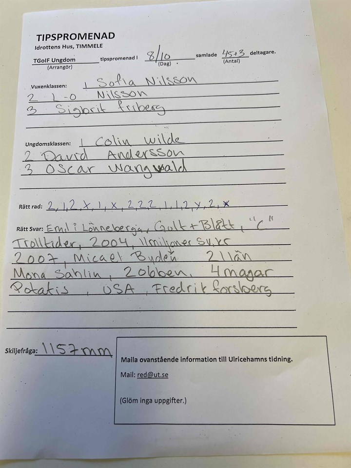 Här kommer resultatet från dagens tipspromenad som samlade 43 st Tack till er som går o stöttar våra ungdomar i föreningen Timmele GoIF 15 okt 2023 0kommentarer