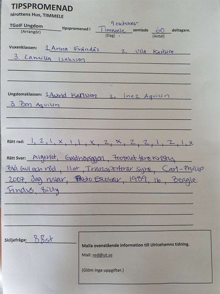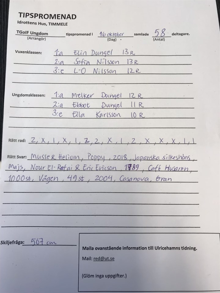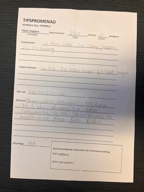 Här kommer dagens resultat från tipspromenaden. Svaret på fråga 15 kom inte med men svaret är: Galtåsen Grattis till vinnarna och tack till er som troget går varje vecka, i både ur o skur. Härliga möten o gofika Timmele GoIF 23 okt 2022 0kommentarer