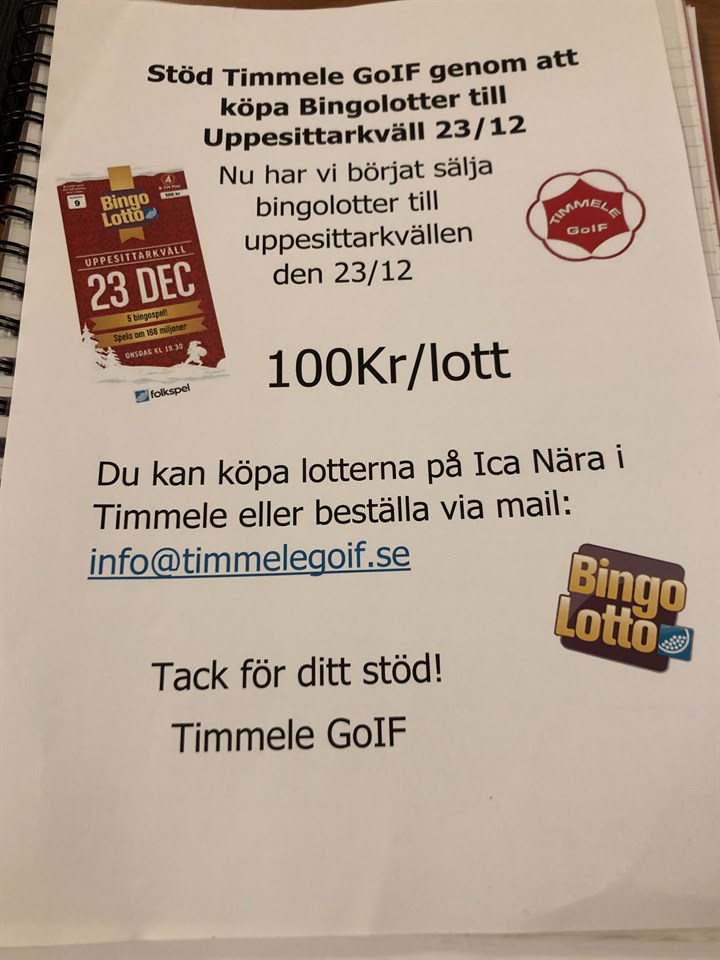 Stöd Timmele GoIF genom att köpa eller beställa bingolotter till uppesittarkvällen den 23/12. Du kan köpa dem på Ica Nära i Timmele eller beställa via vårt hemsida Timmele GoIF 9 nov 2021 0kommentarer