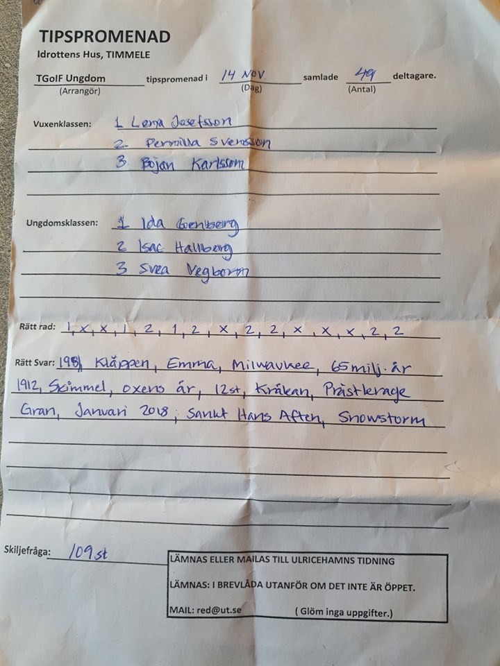 Här kommer resultatet från säsongens sista tipspromenad. Tack till alla som har gått och därigenom stöttat vår förening. Stort grattis till er som vann utlottningen; gå 8 av 10 ggr. Vi ses igen till våren Timmele GoIF 21 nov 2021 0kommentarer