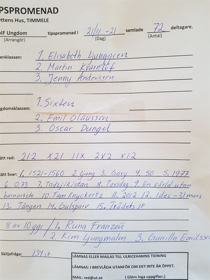 Här kommer dagens resultat från tipspromenaden. Tack till alla som gick o grattis till alla vinnare😁 Timmele GoIF 14 nov 2021 0kommentarer