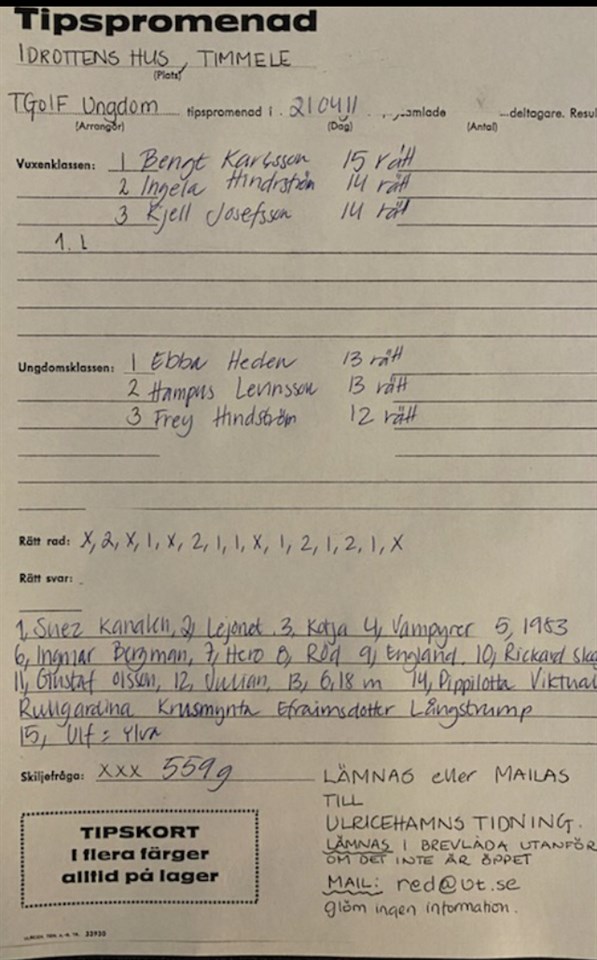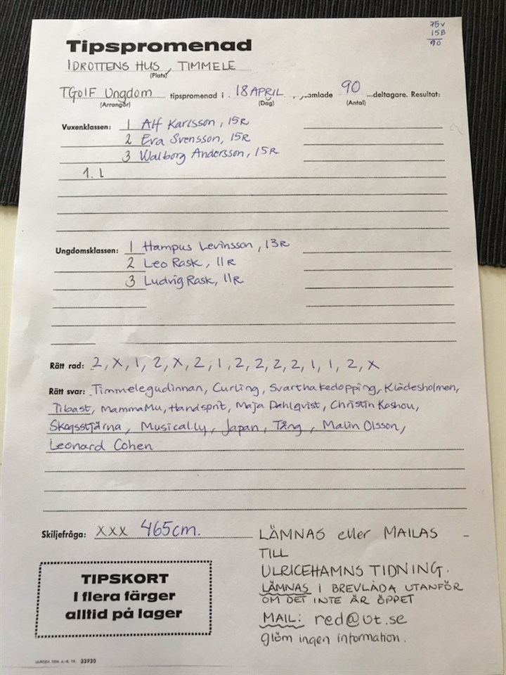 Här kommer resultatet från dagens tipspromenad 18/4 Tack alla 90 personer som gick och stort grattis till vinnarna Timmele GoIF 18 apr 2021 0kommentarer