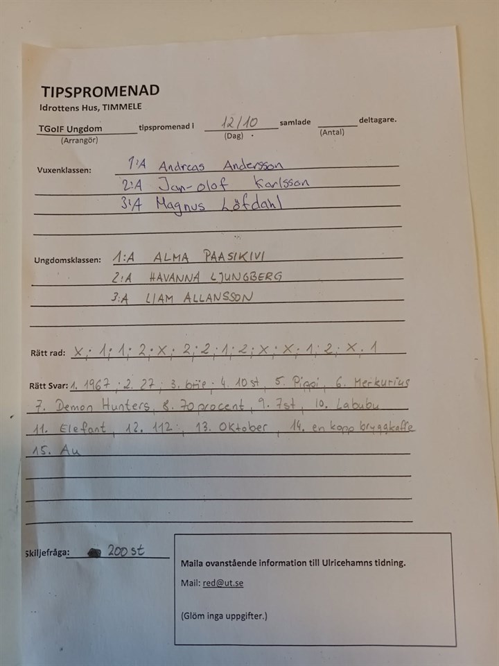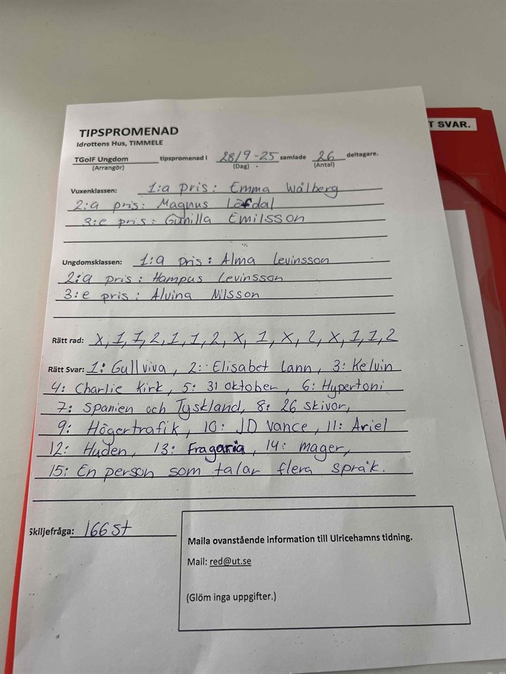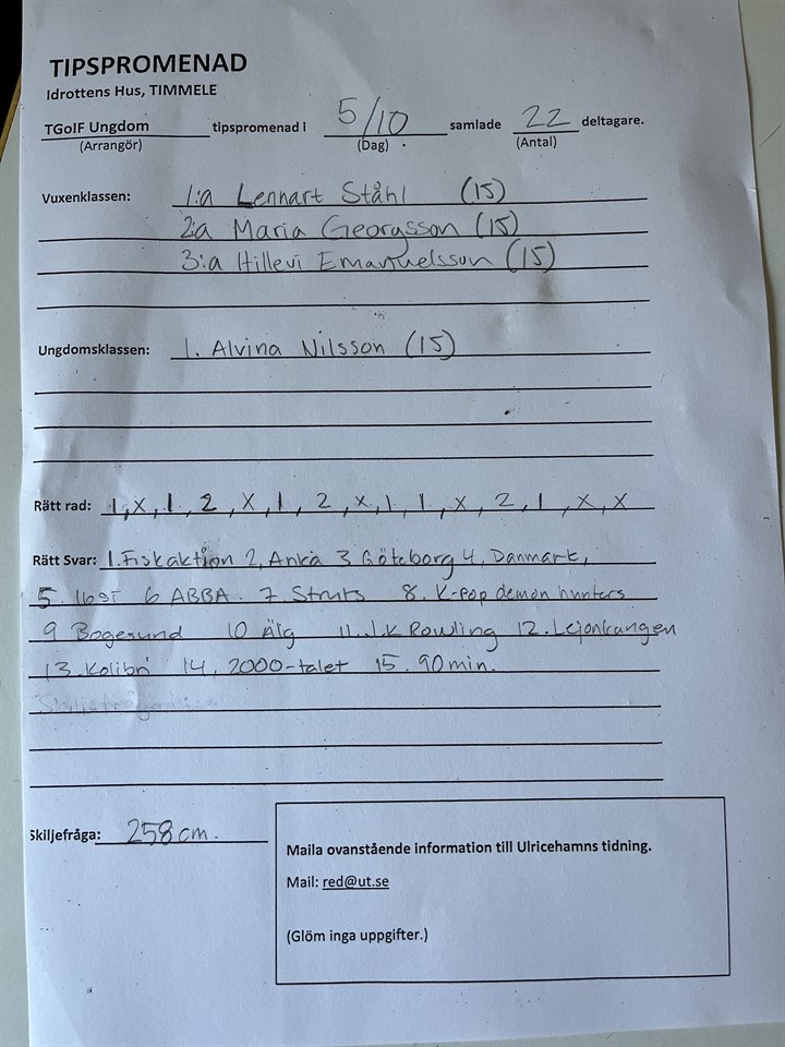 Här kommer tipspromenadens resultat, söndagen den 5/9 Det är några trogna som går tipspromenad varje söndag i både regn o sol. Tack för det🙏 Timmele GoIF 5 okt 0kommentarer